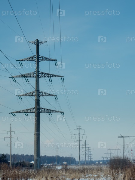 Высоковольтная линия электропередач на фоне голубого неба