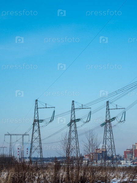 Высоковольтная линия электропередач на фоне голубого неба