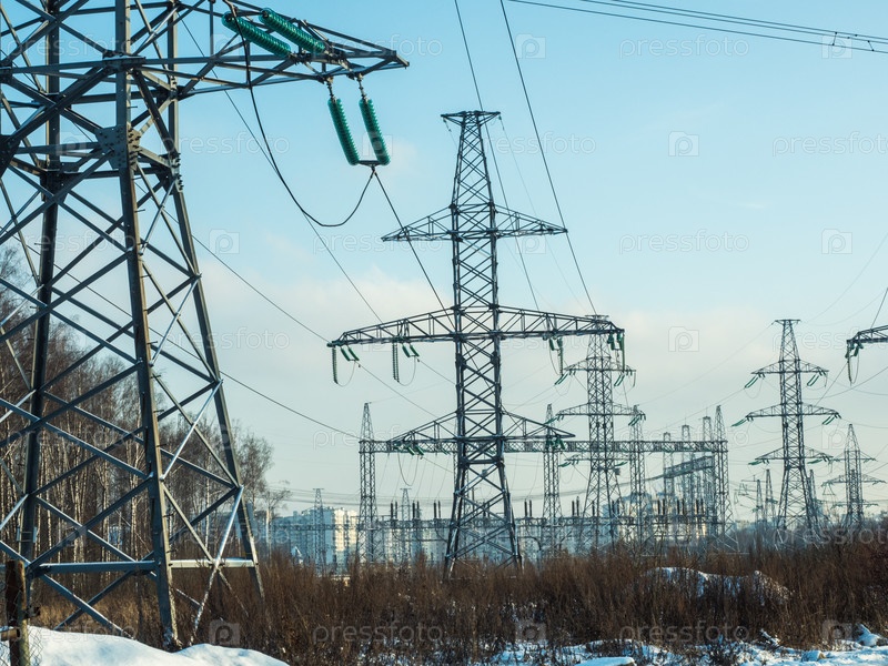 Высоковольтная линия электропередач на фоне голубого неба