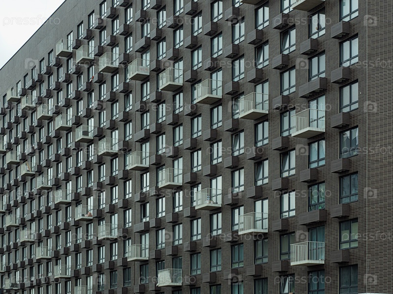 Яркий современный фасад дома с разнообразными окнами и балконами