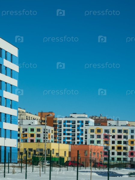Современное новое жилое здание с красивым ярким фасадом