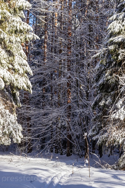 Заснеженный зимний еловый лес. Холодный день, спокойный зимний пейзаж