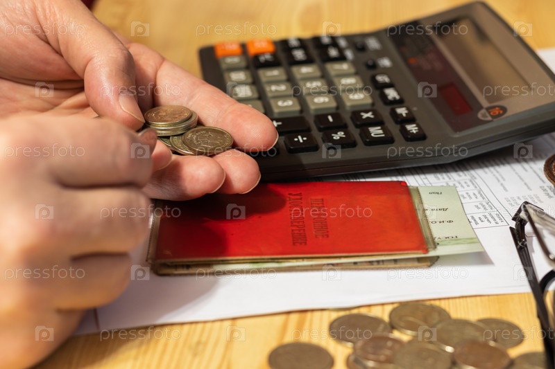 На столе мелкие купюры и монеты, открытый кошелек и очки рядом с пенсионным удостоверением. Надпись: "Пенсионное удостоверение"