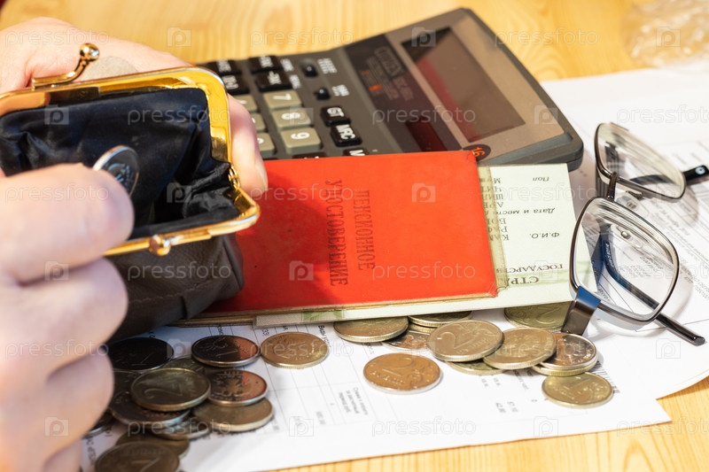 На столе мелкие купюры и монеты, открытый кошелек и очки рядом с пенсионным удостоверением. Надпись: "Пенсионное удостоверение"