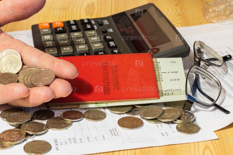На столе мелкие купюры и монеты, открытый кошелек и очки рядом с пенсионным удостоверением. Надпись: "Пенсионное удостоверение"