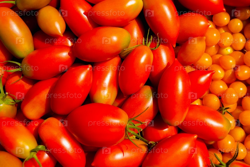 Сочетание красных и желтых спелых помидоров разного размера в качестве фона