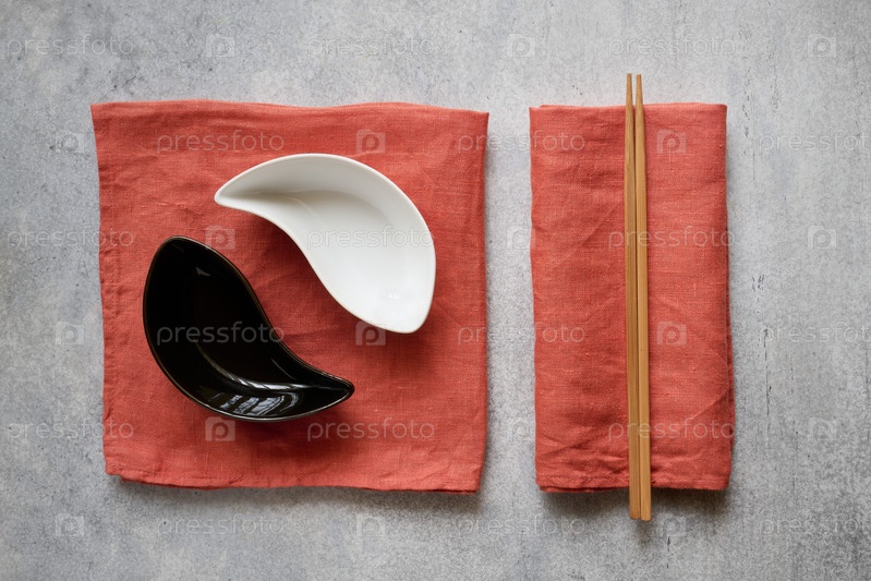 Вид сверху на черно-белые керамические миски и палочки для еды на льняных терракотовых салфетках