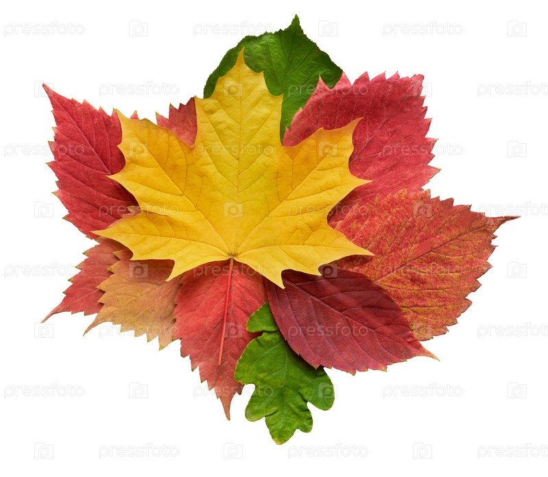 Коллекция осенних листьев дуба, клена, осины на белом фоне. Гербарий, ботаника