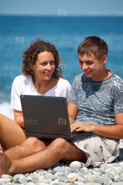 Улыбающаяся молодая пара с ноутбуком на берегу моря