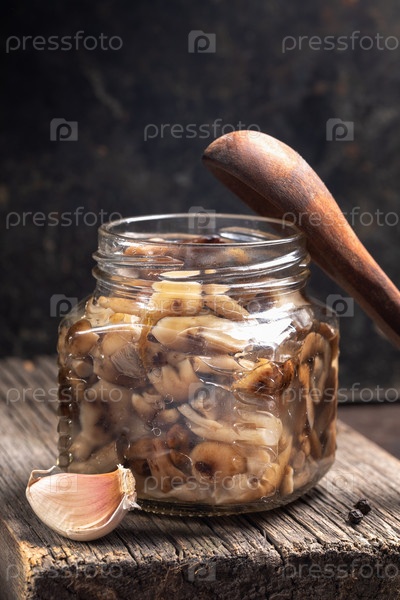 Крупный стеклянный кувшин с домашними маринованными лесными опятами, деревянной ложкой и чесноком на старой деревянной доске