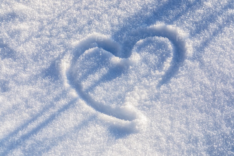 Рисунок сердца на белом снегу с диагональными синими тенями. Концепция дня святого Валентина