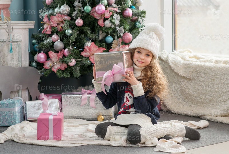 Милая маленькая девочка в зимней одежде позирует дома перед рождественской елкой с подарочной коробкой в руке