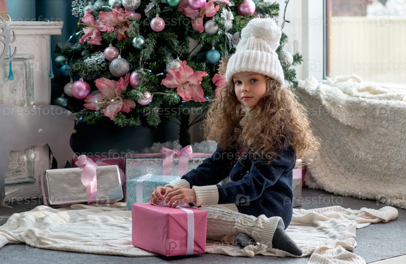 Милая маленькая девочка в зимней одежде позирует дома перед рождественской елкой с подарочной коробкой в руке