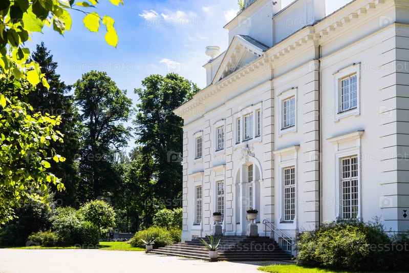 Поместье Узутракис. Особняк с колоннадой, окруженный ландшафтным садом. Тракай, Литва, 2 июля 2022 г