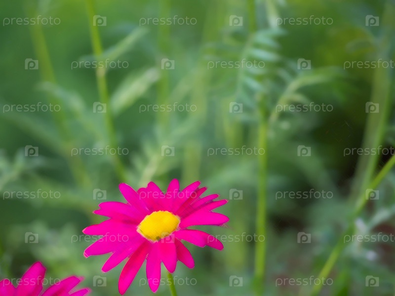 Естественный фон. Рисунок розового цветка ромашки с желтым центром на фоне зеленой травы