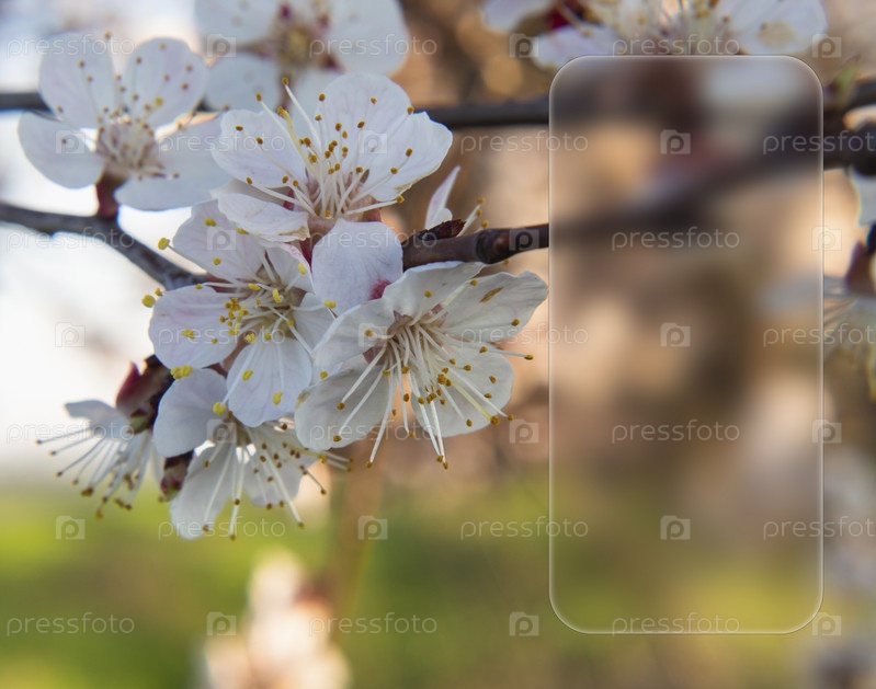 Белые абрикосовые цветы на ветке в саду в солнечный день в весенний день с окном из матового стекла для вашего текста. Крупный план цветов с тычинками и пестиками. Пустое пространство с рамкой