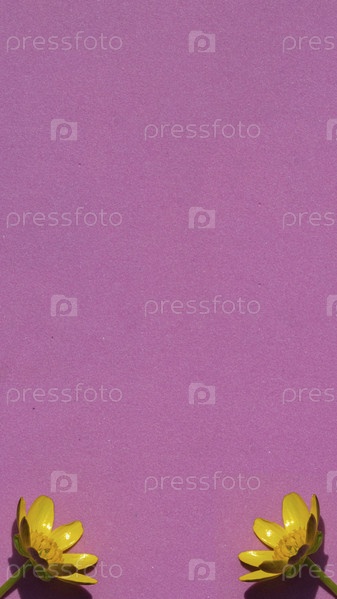 Цветочная композиция из двух желтых цветов на розовом фоне. Плоский вид сверху. Готовый шаблон для инстаграма