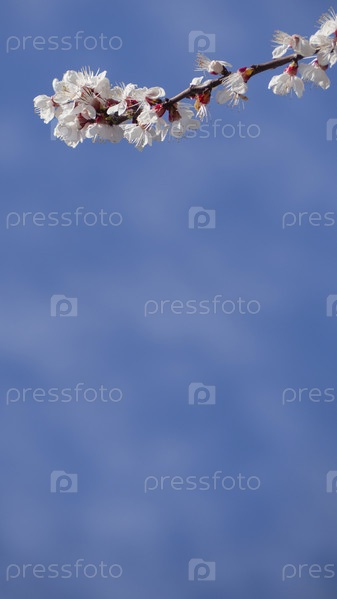 Цветущая ветвь на фоне голубого неба. Формат для смартфонов. Нежные белые цветы абрикоса. Лазурно-голубое небо с размытыми белыми облаками. Пустое пространство для творчества и текста