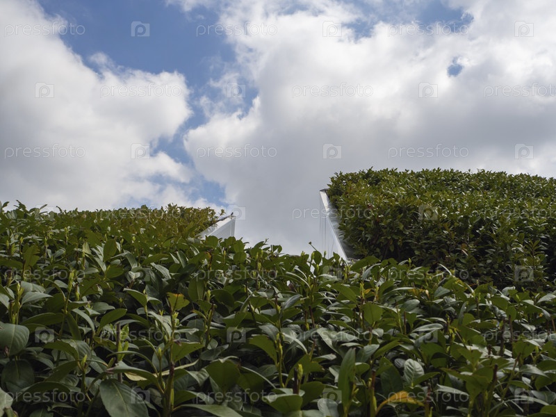 Зеленые кусты уходят в голубое небо с облаками. Небольшие кусты с зелеными листьями растут на крутом склоне на фоне лазурного неба с белыми пушистыми облаками