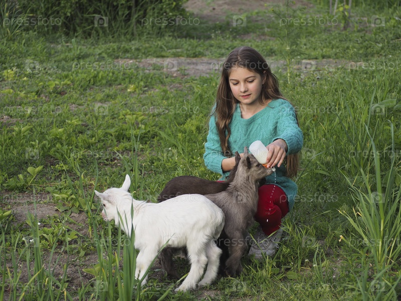 Девушка с козами. Девочка-подросток с бутылкой молока в руке в окружении козлят. Здоровый образ жизни и агротуризм