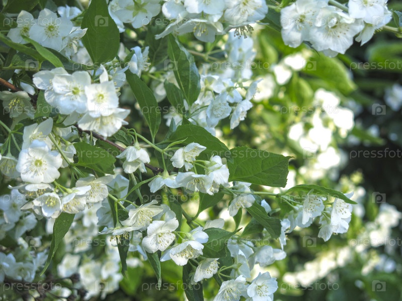 Жасмин летом благоухает на кусте в саду