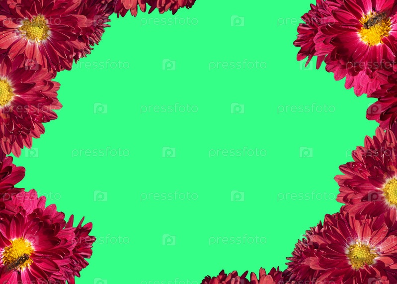 Рамка из красно-бордовых цветов хризантемы на зеленом фоне. Цветочный узор на зеленом фоне. Плоская укладка. Подарочная карта на День матери с двойной каймой из красных цветов. Место для копирования