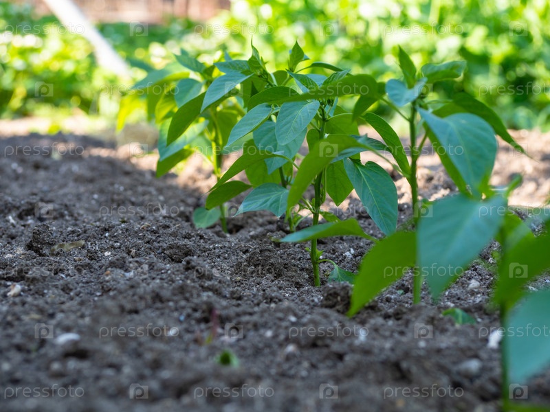 Ряд кустов зеленого овощного перца. Молодые саженцы перца, растущие в открытом грунте на экоферме, небольшая глубина резкости. Выращивание органических овощей