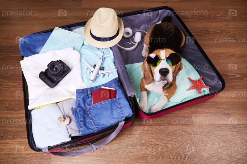 Собака-бигль в солнечных очках лежит в открытом чемодане с вещами и аксессуарами для отдыха