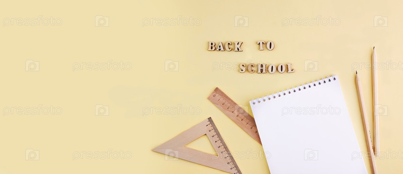 Школьные принадлежности: пустая тетрадь, деревянные карандаши