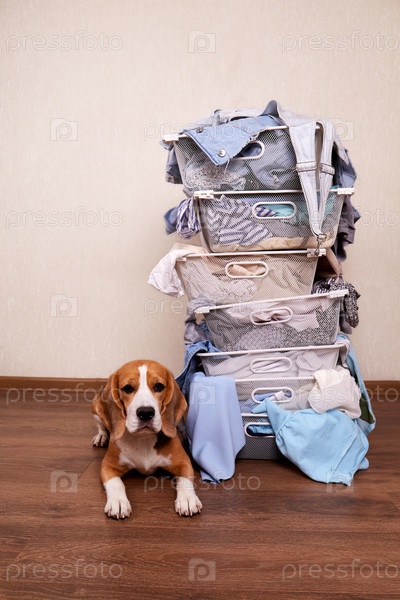 Собака бигля лежит рядом с металлическими корзинами