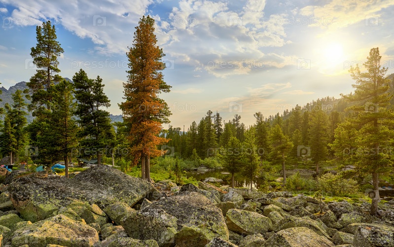Утренний пейзаж в сибирском горном лесу