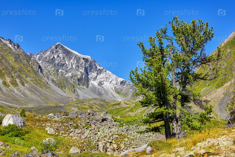 Старый кедр на фоне сибирской тундры в высокогорье. Из одного корня вырастают три ствола дерева. Восточные Саяны. Бурятия. Россия