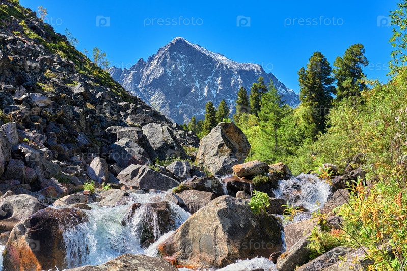 Альпийский пейзаж с каскадом воды на горном ручье. Восточные Саяны. Бурятия