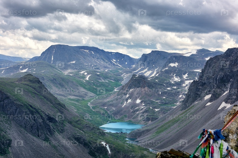 Высокогорье в Восточном Саяне. Вид сверху на небольшую долину с красивым озером