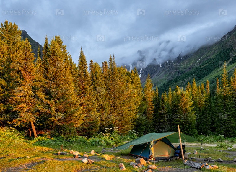 Вечерний солнечный свет освещает край темной хвойной тайги