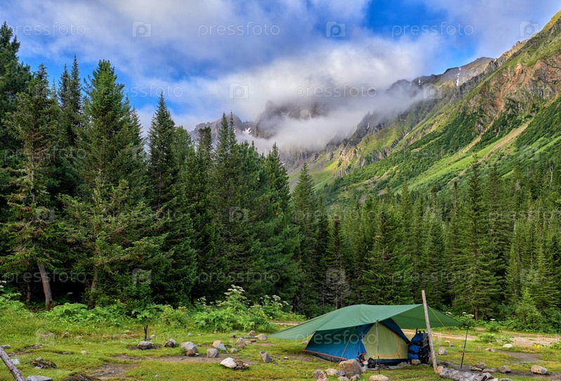 Пеший туризм. Одна палатка установлена возле горного леса