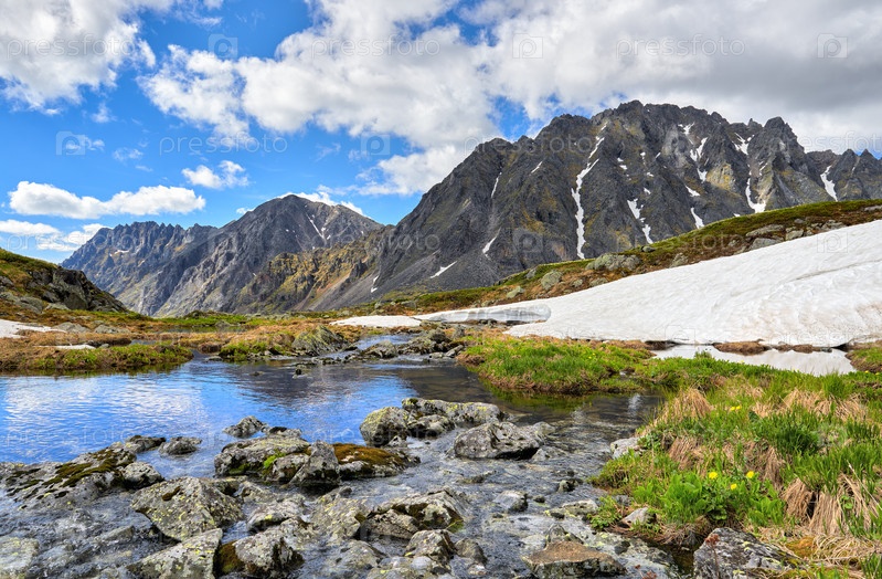 Сибирский горный пейзаж. Камни, покрытые мхами и лишайниками над водой
