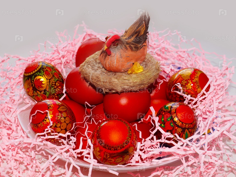 Декоративная фигурка пасхального цыпленка и куча свежих праздничных яиц