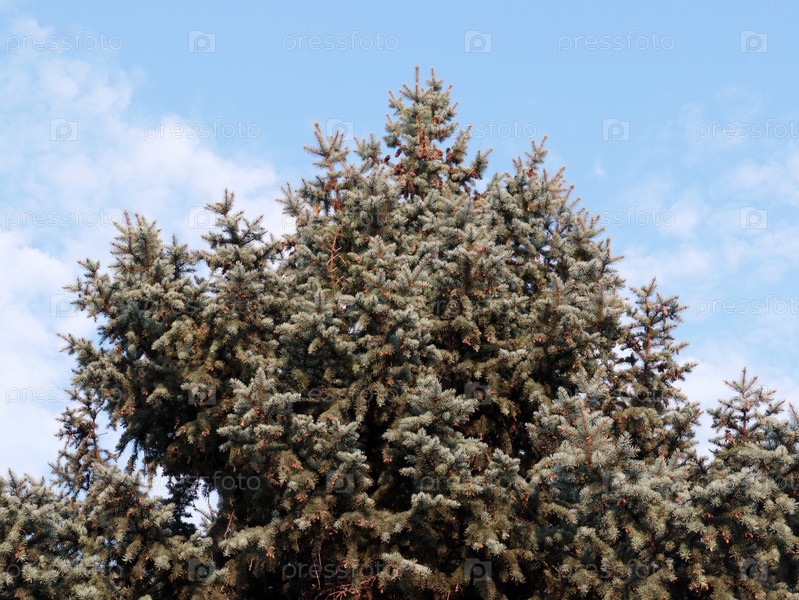 Красивая новогодняя елка на фоне голубого солнечного неба