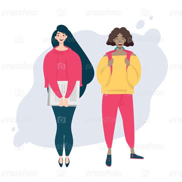 Векторная иллюстрация. Два студента. Девушка и парень африканской, азиатской национальности. Плоский дизайн. Празднование шаблона дизайна