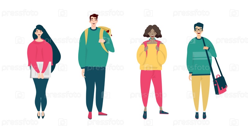 Векторная иллюстрация. Многонациональная группа студентов. Две девушки африканской и европейской внешности. Два парня европейской и азиатской внешности. Плоский дизайн. Празднование шаблона дизайна