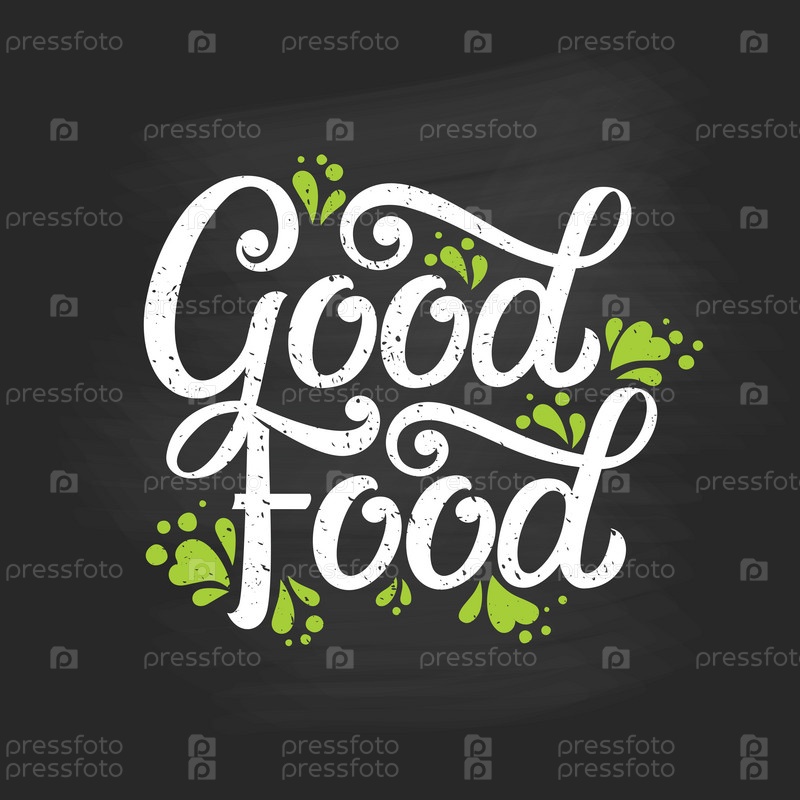 Хороший векторный дизайн пищевой типографии для медицинских центров, органических и вегетарианских магазинов, плакат, логотип. Хороший векторный текст еды на доске. Каллиграфические надписи ручной работы. Векторная иллюстрация
