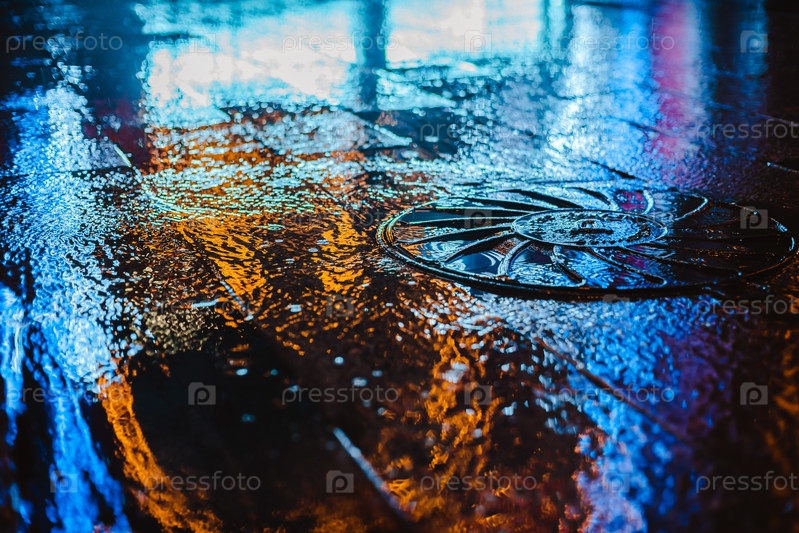Дождливая ночь в большом городе, отблески огней на мокрой поверхности дороги
