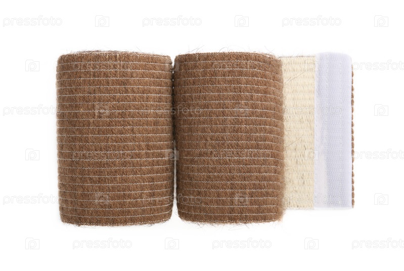Два эластичных бинта из верблюжьей шерсти крупным планом на белом фоне