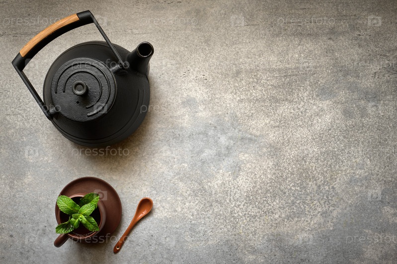 Чай, чашка и чайник на сером фоне с копией пространства