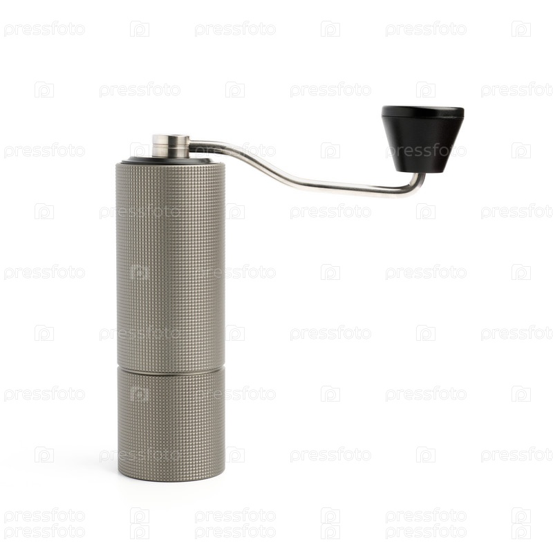 Текстурированная алюминиевая ручная кофемолка на белом фоне крупным планом