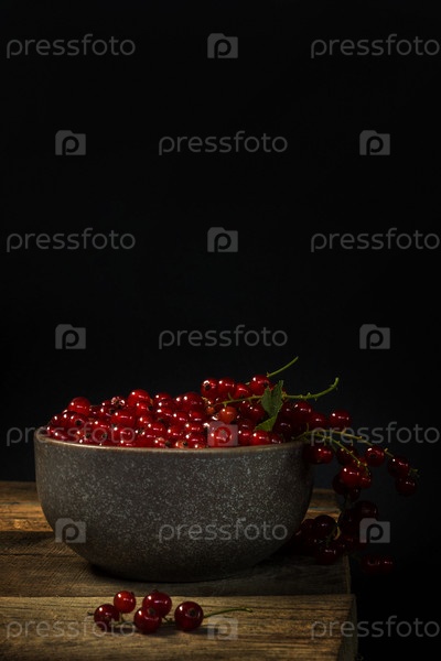 Красная смородина в миске на черном фоне. Органические ягоды из деревенского сада. Деревянный старинный стол. Стиль кантри