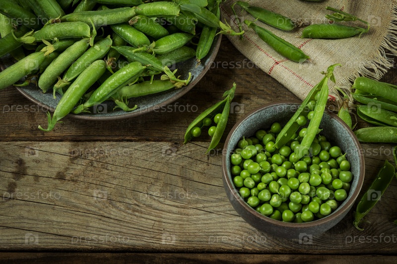 Зеленый горошек очищенный и в стручках на деревянном фоне