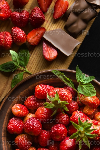 Клубника, шоколад и листья мяты на черном фоне. Выборочный фокус. Место для теста. Плоская планировка