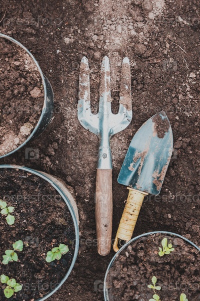 Весенние работы в саду. Садоводство. Саженцы цветов. Садовые инструменты. Концепция садоводства и посадки
